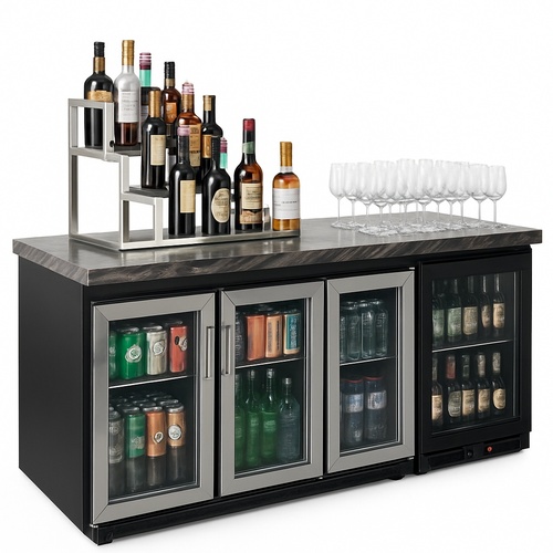 Complete bar setup for commercial and event use. Provides essential components for a fully functional beverage service area. Designed for professional operations.