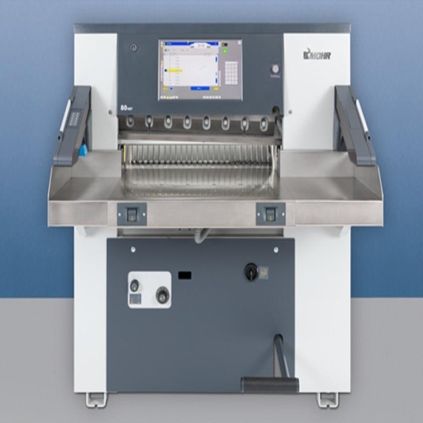 Mohr 80 programmable guillotine machine with 800mm cutting width. Max clamp pressure 2700 daN. Backgauge speed 130 mm/sec. Handles up to 100 mm feeding height.