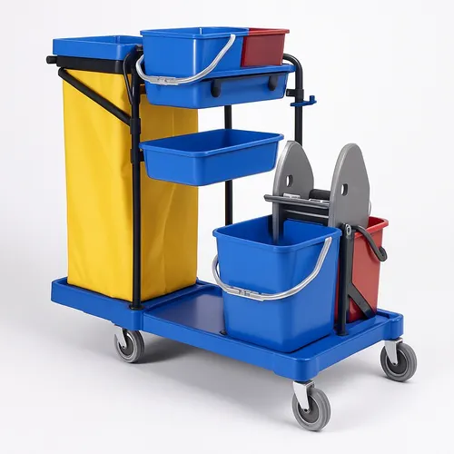 PROKLEEN multifunction plastic janitor cart with 3 shelves and 4 wheels. Features a 46 L bucket capacity. Suitable for hotels, hospitals, and industries.