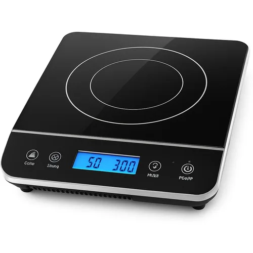 Commercial induction cooktop with stainless steel body and push button controls. Features temperature settings, ISI certification, and a metal finish. Portable and made in India.