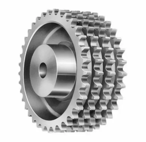Customizable quadraplex four-strand sprocket for various chain sizes. Available in customized shape, finishing, and color. Technical material grade, made in India.