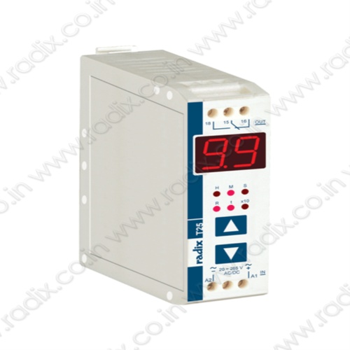 Radix T25 digital DIN rail timer with 0.01% accuracy. Features snap-on mounting, 5A/230V AC relay, front panel reset, and 2-key programming. Operates on 20-265V AC/DC.
