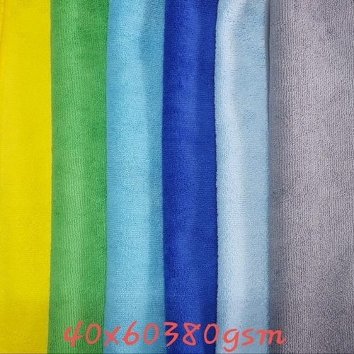 Microfiber cloth, 40x60 cm, available in blue, green, grey, yellow. 300 & 380 GSM, cotton fabric, reusable for cleaning. Packaged in bulk.
