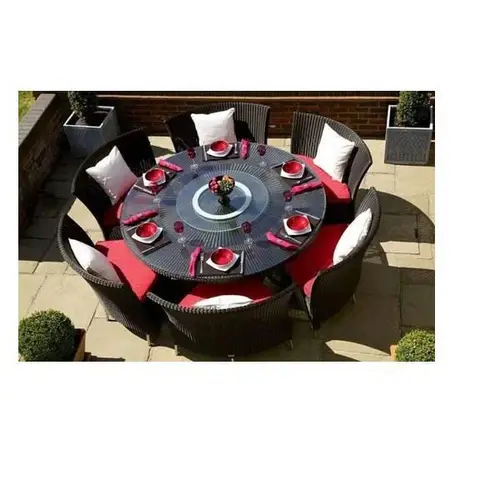 Round rattan dining set with 6 chairs, featuring cushioning. Suitable for outdoor garden use, available in all colors. Durable and stylish patio furniture.