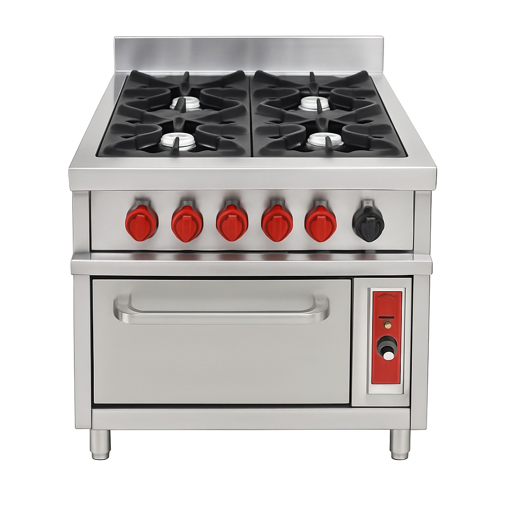 Raunak stainless steel burner cooking range with oven, silver color. Manufactured in India for general cooking applications.