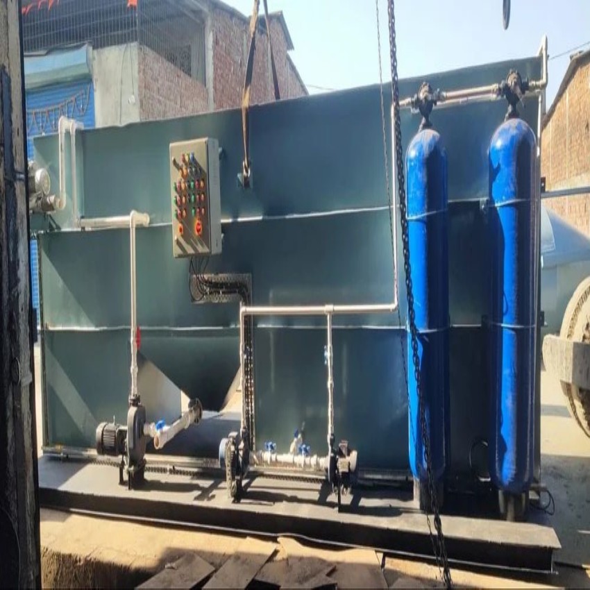 Automatic 500 KLD RCC portable sewage treatment equipment for pharmaceutical and chemical industries. Removes dissolved minerals using MBBR technology. Carbon steel construction, 1 KW water pump power.