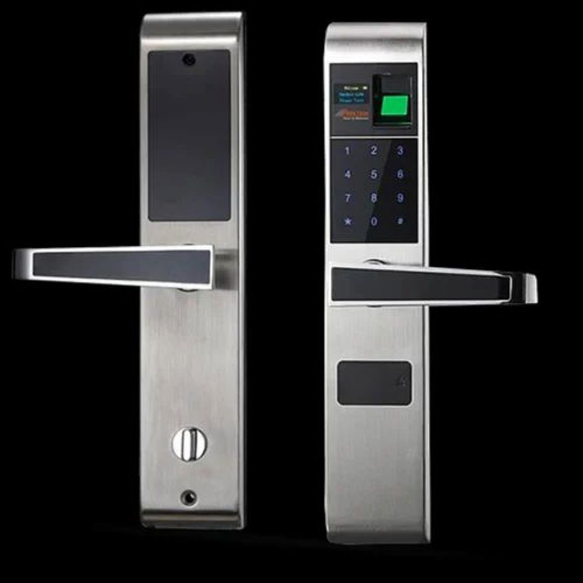 Stainless steel mortise smart door lock with optical fingerprint sensor (500 DPI), 200 fingerprint capacity, and 36-digit virtual password. Ideal for main doors.