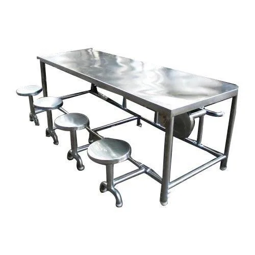 Rectangular canteen dining table with a stainless steel top and chrome surface finish. Features SS seating with a seat height of 1.7 feet.