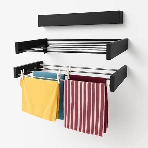 Black stainless steel clothing stand with a rectangular shape. Offers a sleek and modern design for organizing garments. Durable construction for long-lasting use.