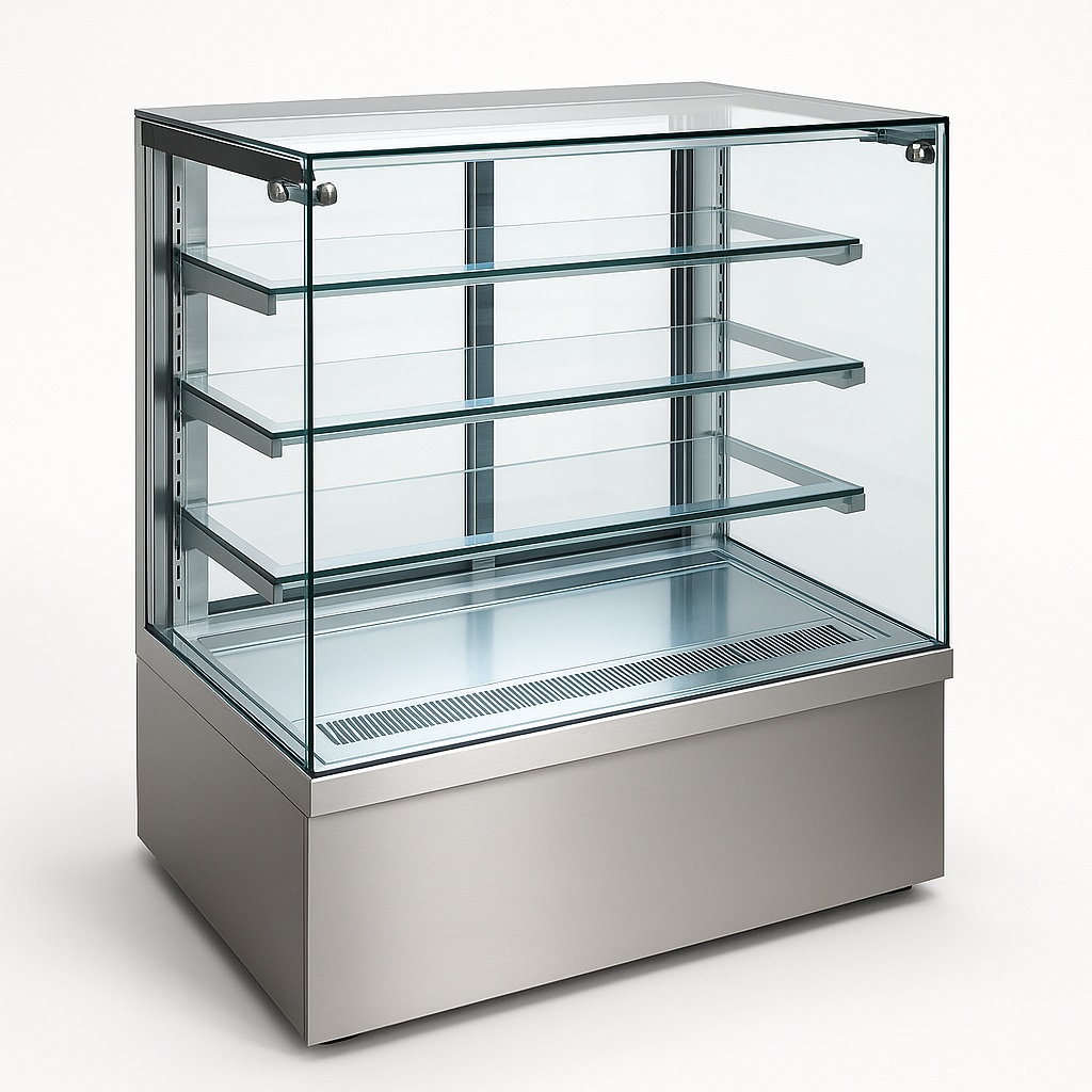 Rectangular 4ft glass pastry display counter with 2 shelves. Features 12mm glass thickness, 304-grade sheet, and cooling refrigerant for commercial applications.