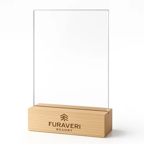 Rectangular acrylic menu holder with wood holder mounting. Designed for hotel use, available with a minimum order quantity of 25 pieces. Durable and functional.