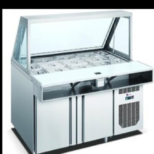 Silver rectangular stainless steel Pizza Preparation Counter. Ideal for hotels and restaurants, this durable counter provides a hygienic and efficient workspace for pizza preparation needs.