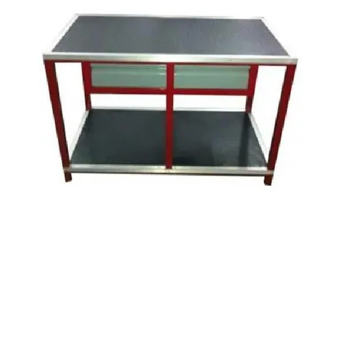 This rectangular workbench is constructed from mild steel in a silver color. It features a standard design with four legs, suitable for various industrial applications. Made in India.