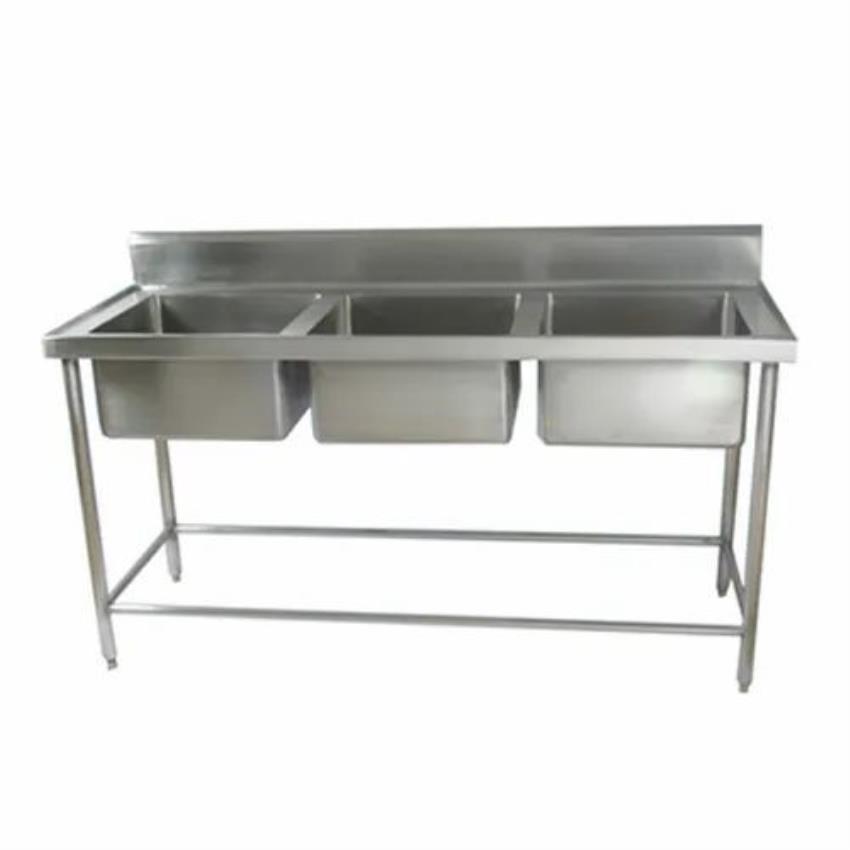 This coated stainless steel sink features three rectangular bowls. Ideal for high-volume use, it offers durability and a clean aesthetic.