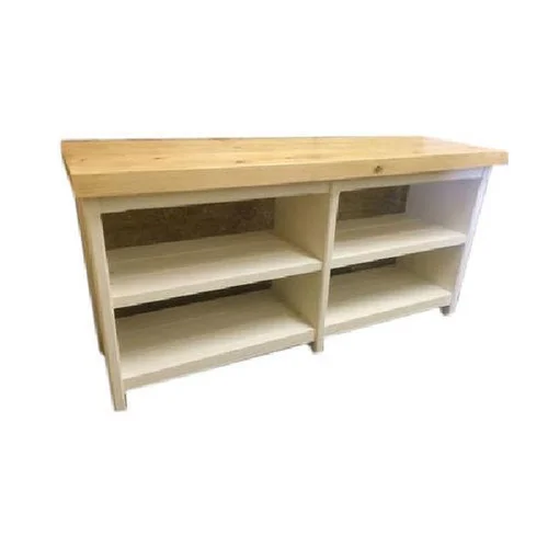 Rectangular wooden display counter measuring 6x2 feet. Features a brown and cream color combination, suitable for commercial applications. Constructed from durable wood for long-lasting use.
