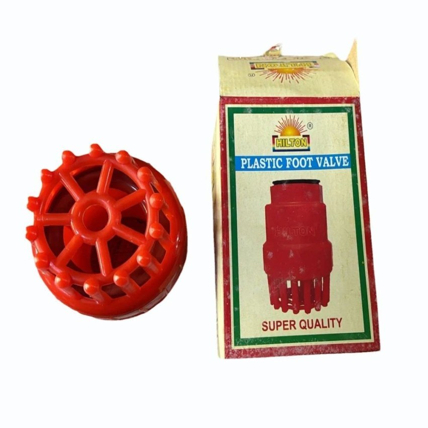Red plastic foot valve for industrial use. Features a round shape and welded end connection. Manual automation grade, 1.5 inch valve size.