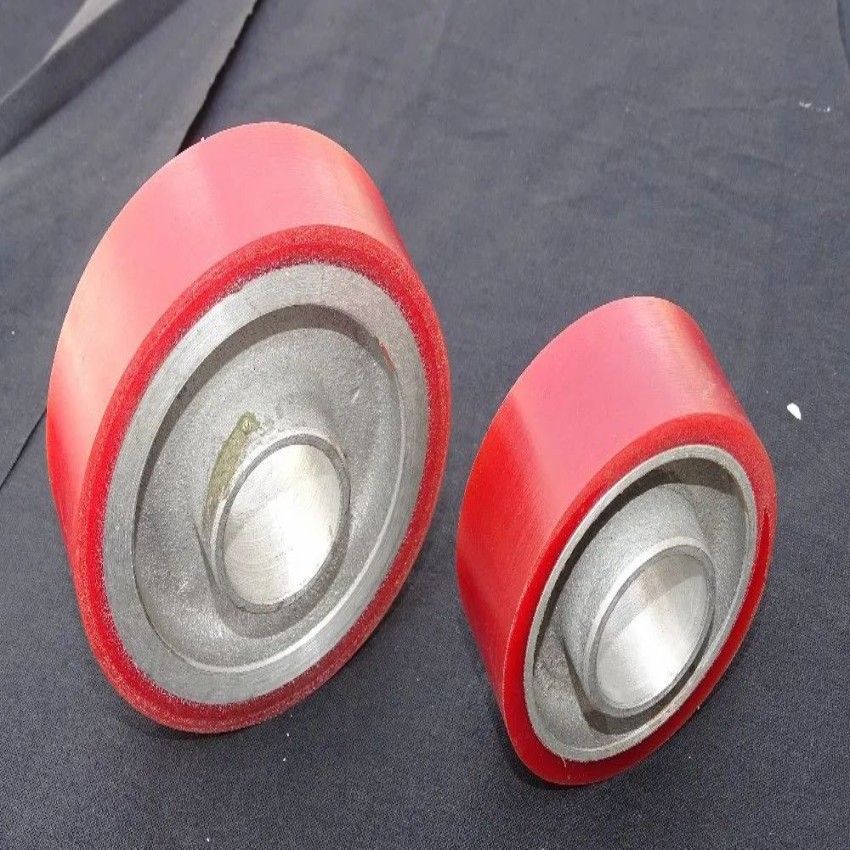 Red polyurethane wheel and roller with a 1000 KG loading capacity. Customized size available for various industrial applications.