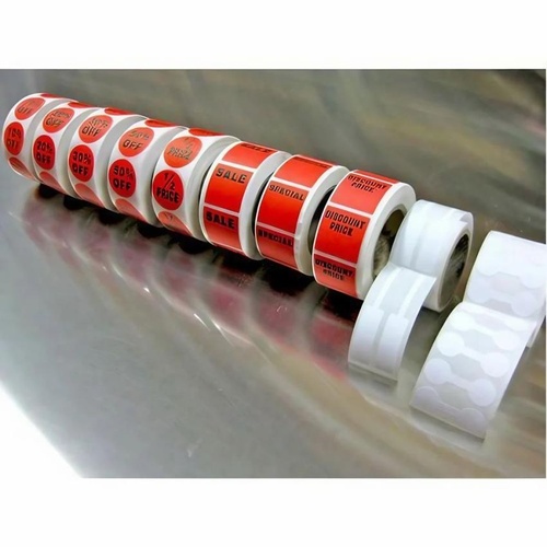 Printed red and white jewelry labels on a roll. Available in 5-10 meter length, 0.80 mm thickness. Minimum order 10,000 pieces. Packet packaging.