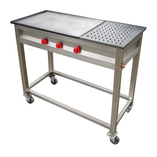 Horizontal stainless steel chapati puffer plate, 18"x36"x32". Features 3 burners, producing 700 chapatis per hour. Restaurant application.