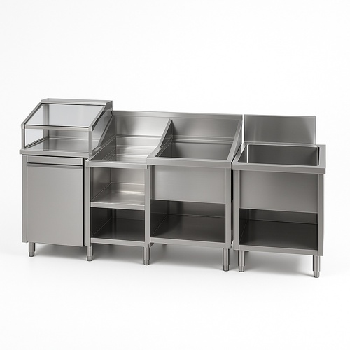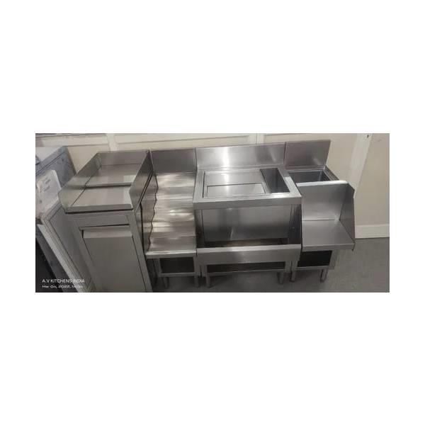 6-foot stainless steel bar setup for restaurants. Grade 18 SWG 304 material, 1.6 mm thickness. Designed for commercial kitchen and bar layouts. Silver color.