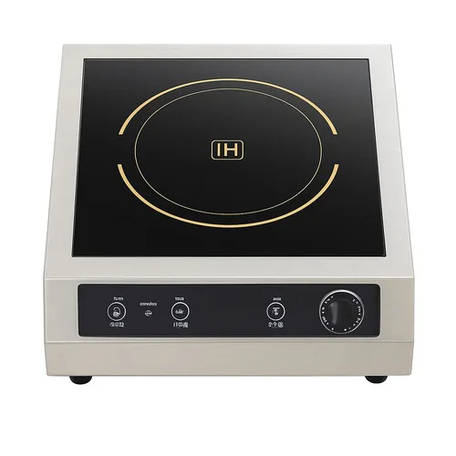 Black commercial induction cooker for restaurant use with intuitive push-button controls. Durable, India-made equipment designed for professional kitchens. Efficient and reliable operation.
