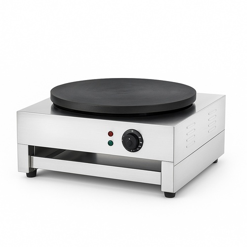 Semi-automatic SS crepe machine for restaurants. 360mm plate diameter, 400C temperature. Produces 14 dozens/hour. Standard, CLASSIC type.