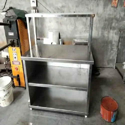 A restaurant pickup counter with warmer, featuring a stainless steel construction. It includes 3 shelves and a powder-coated surface finish, designed for restaurant use.