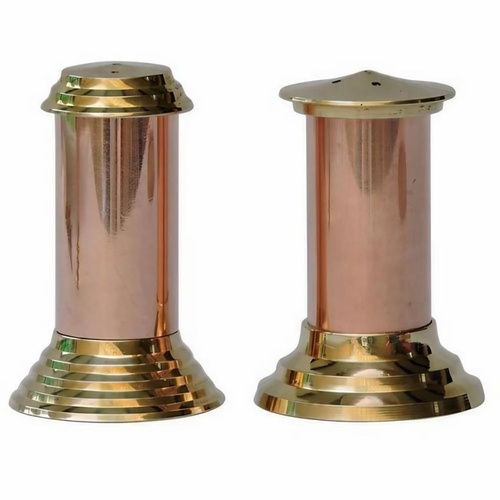 Two-piece brass and copper salt and pepper set. Features a round base, 4.8 cm diameter, and 7 cm height. Polish finish, weighing 110 gm. Packaged in a box.