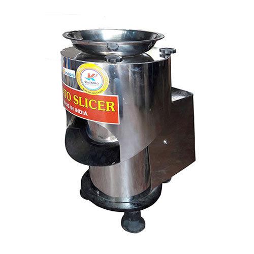 Semi-automatic potato slicer made of SS material, silver color. Designed for restaurant use. Durable construction for efficient slicing.