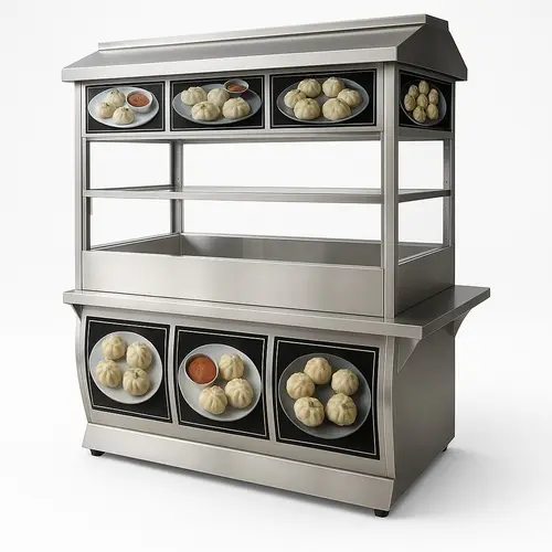 Durable Stainless Steel Momos Counter, 6-inch depth, rectangular shape. Ideal for restaurant use. New condition, made in India with 20-liter capacity.