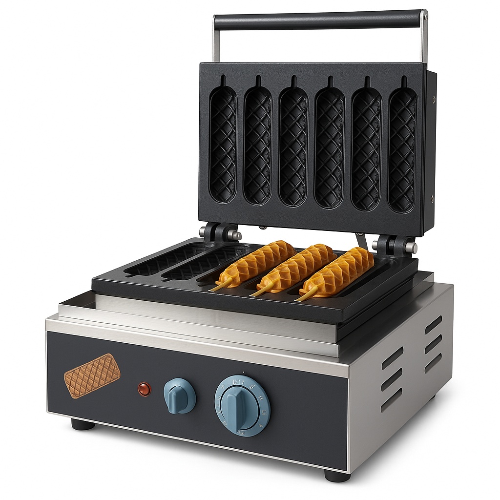 Restaurant-grade stick waffle machine, 1550W, 220V electric powered. Constructed with durable stainless steel for heavy-duty commercial use. Weighs 15 Kg.