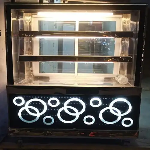 Rectangular stainless steel sweet display counter for restaurants. Features 1 shelf, 4ft height, 6-inch depth, 20-liter capacity, in grey.