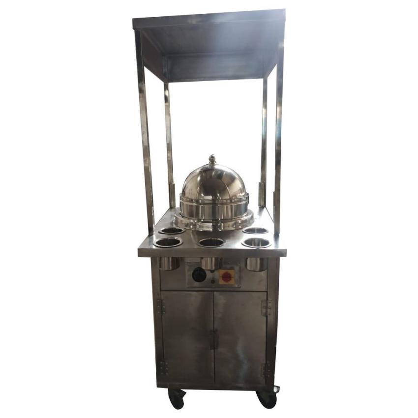 Silver stainless steel sweetcorn counter with polished finish. Features 4 wheels for mobility and electric power source. Ideal for restaurant usage. Minimum order of 5 units.