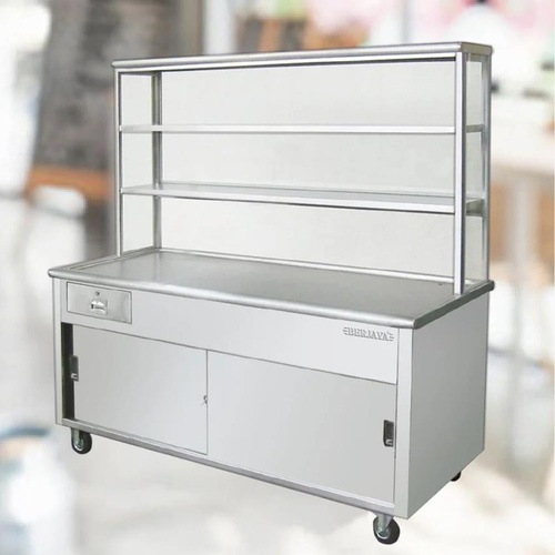 Black stainless steel restaurant counter with a burner. Features 3 shelves. Designed for commercial kitchen and service applications. Minimum 1 piece order.