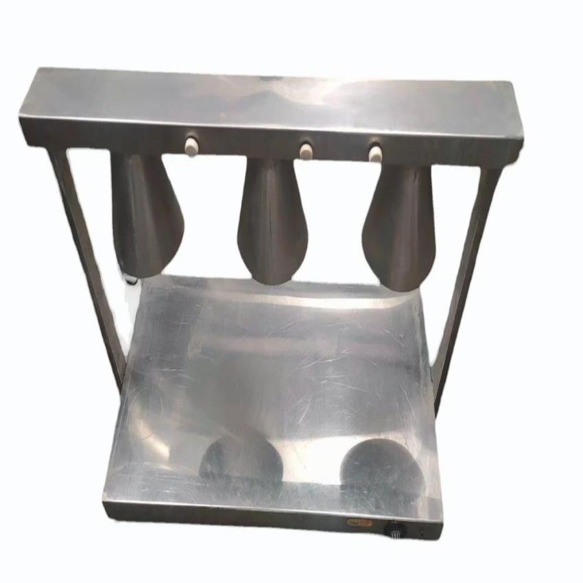 Commercial stainless steel electric food warmer with three bulbs. 2.5 kW power, 240V, 50 Hz. Corrosion resistant, silver color. Size: 32 X 18 X 30 Inch.