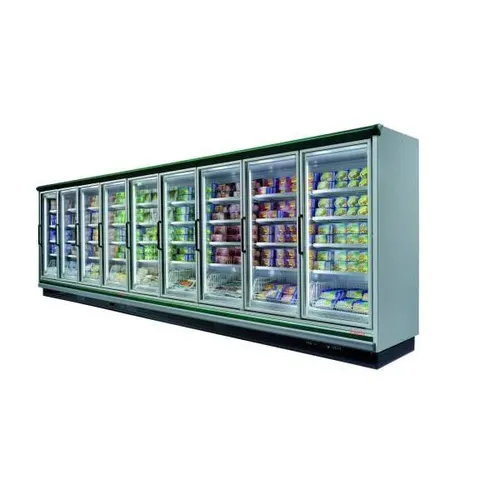 Glass door side-by-side retail refrigeration machine for food. Features multiple compartments for optimal storage and display of perishable goods.