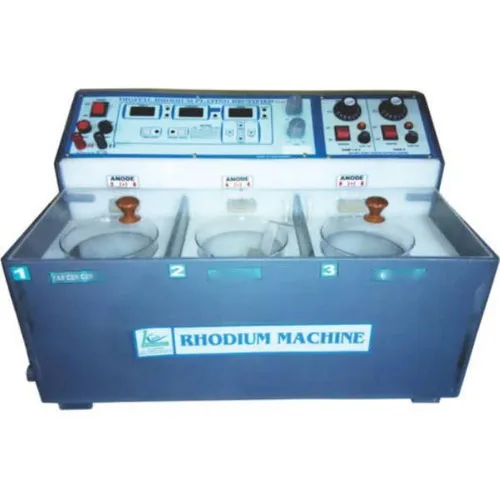 3 Ltr capacity rhodium electroplating machine. Operates on 230-440V, 50Hz, single/three phase. Recovery rate 60-70%. Temperature range -10 to +70°C.