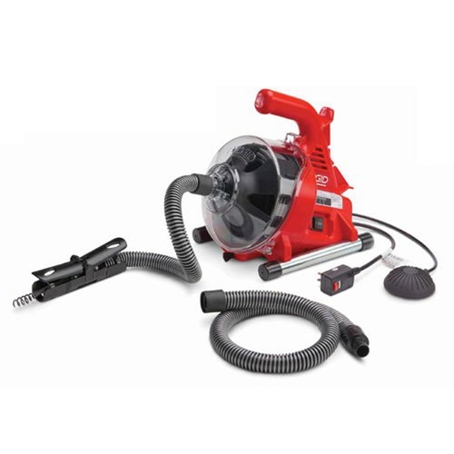 Ridgid Powerclear drain cleaning machine with 120 VAC motor. Features 30 ft cable, 450 rpm operating speed, and 18 ft/min feed rate. Cleans 3/4 to 1 1/2 inch drains.