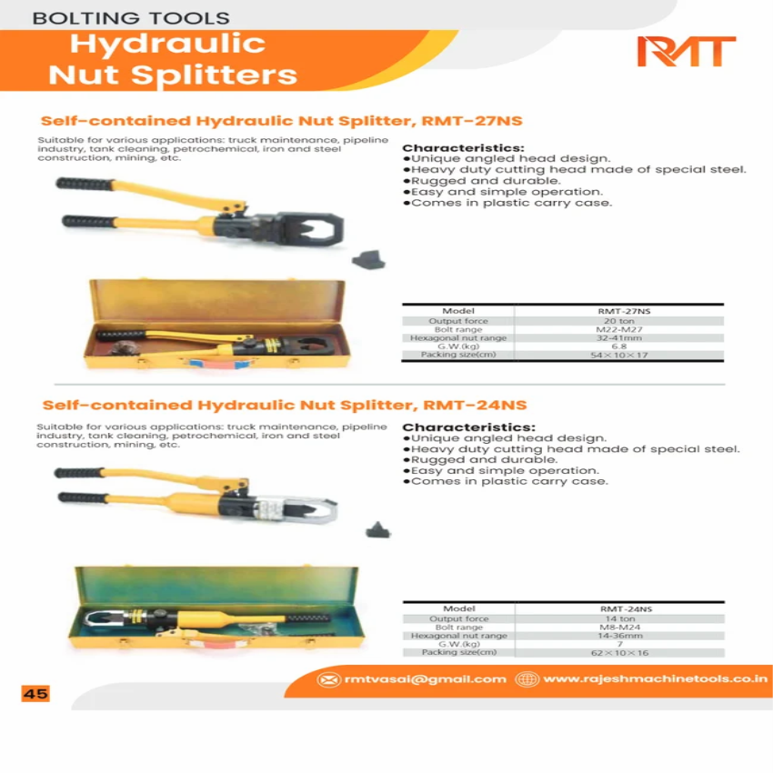 RMT nut splitter equipment for truck maintenance and pipeline industry. Splits bolts M8-M24, hexagon nuts 14-36mm. Max splitting force 14 Tons. Weighs 3.3 Kgs.