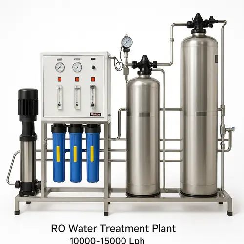 RO water treatment machine with 10000-15000 LPH capacity for borewell water. Features 5 filtration stages, electric power source, operating on 380-420V and 50/60 Hz frequency.