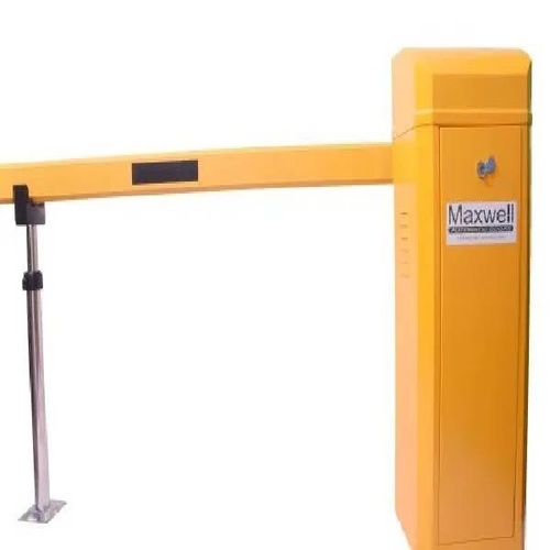 Automatic yellow boom barriers, 4 meter size, made of stainless steel for road safety. Single phase, ideal for traffic management.