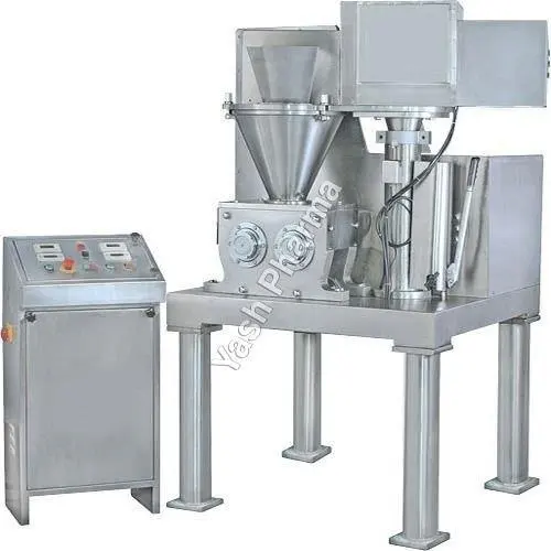 SS construction with 440V, 50 Hz supply. Features plain and water-jacketed modes, variable screw/roll speeds, and 2-5 kg/hr capacity. Driven by 2 HP feeder and 3 HP roller motors.