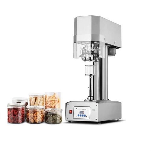 AC220V semi-automatic can seaming machine with a rotating head system. Stainless steel body ensures durability. Offers a capacity of 10-20 bottles per minute.