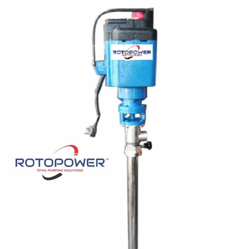 10 Mtr. Stainless Steel ROTOPOWER flameproof motor barrel pump. Features SS-316 pump material, 1.1 HP, 220V motor, 40 LPM max flow, 50 Hz frequency, and 10 Mtr. head. For drawing liquid from barrels.