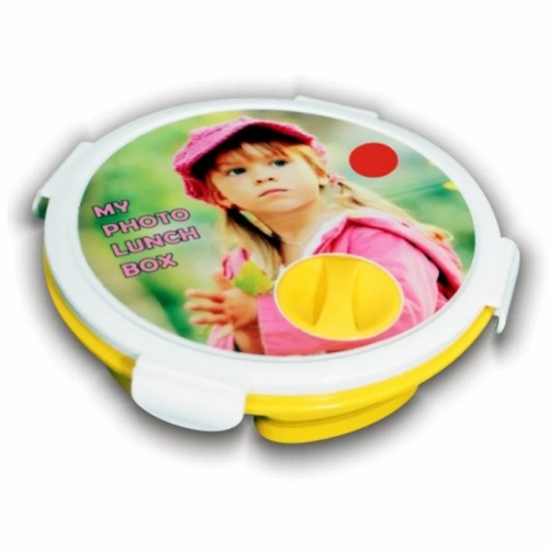 Yellow, round, plastic lunch box with 3 compartments. Opaque design, suitable for sublimation printing. Minimum order quantity of 10 pieces. Does not include a cover.