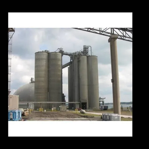 Automatic, round, vertical cement storage silo made of MS/SS. Ideal for construction sites, stores fly ash, limestone, and cement.