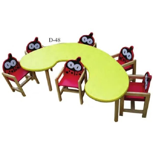 Yellow and Red rubber wood bean shape table. Seats 6 people. Minimum order quantity of 1 set. Ideal for educational settings. Made in India.