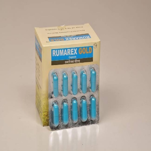 Rumarex Gold Capsule, packaged in a bottle. Each capsule is presented in a dosage form suitable for consumption. Item dimensions: 25 x 12 x 3 cm. Net quantity of 1 count.