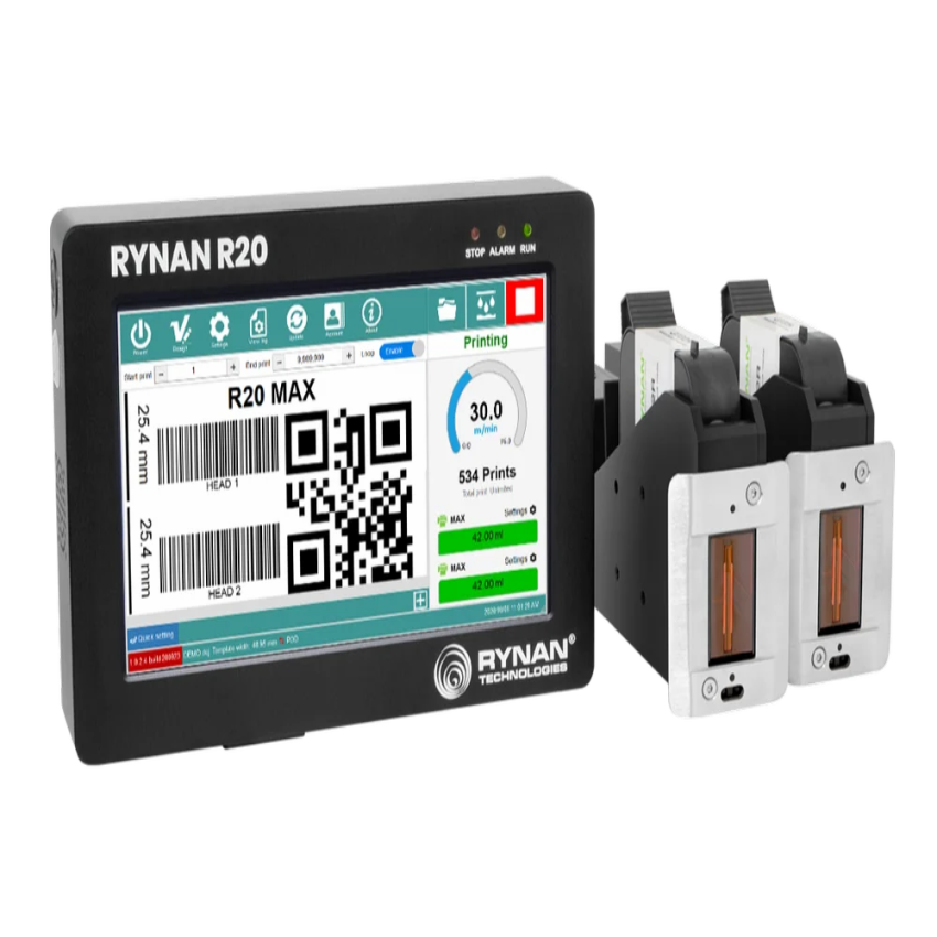 Rynan Thermal Inkjet Printer R20 Max with 7" LCD touchscreen. Prints at 70 m/min, 300 dpi, 25.4mm font height, and 1 inch TIJ technology.