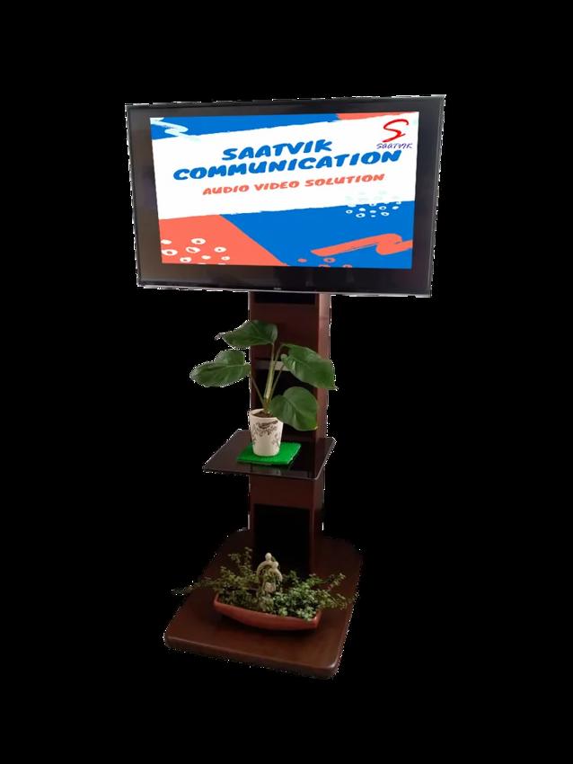 Brown wood TV stand for hotels, suitable for 32-55 inch LED TVs. Features a free-standing unit design and wood frame. 1-year warranty. Made in India.